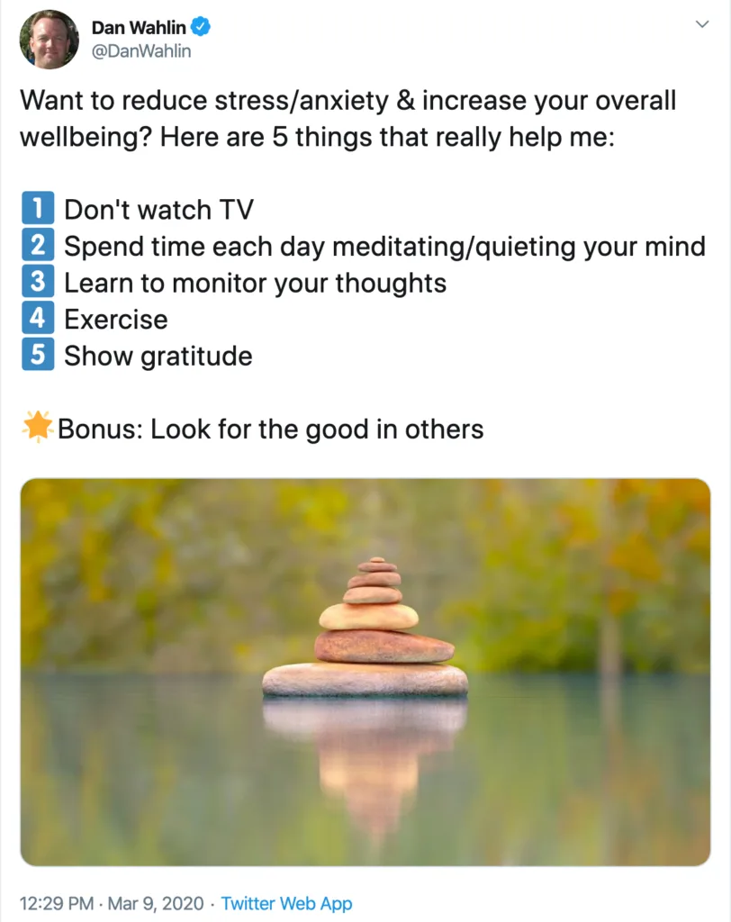 With all of the seemingly non-stop negative events going on in the world I put out this tweet recently to provide some simple guidance to people who may be struggling with stress and anxiety: