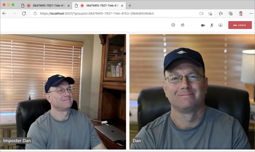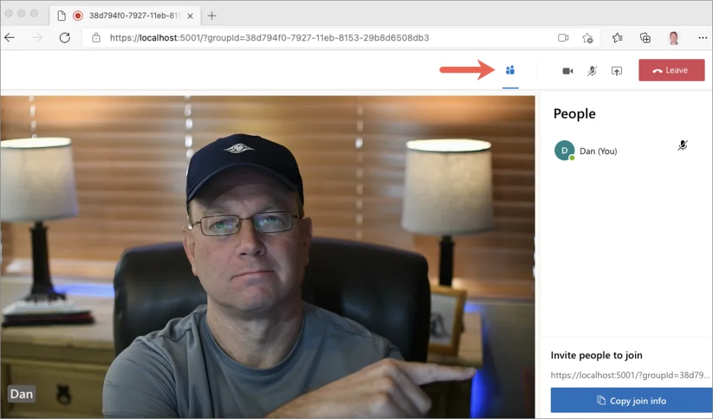 It takes at least two people to talk of course, but since you’re on localhost you can only invite yourself to a call. It works though for testing purposes. If you click the invite people icon (see below), select the Copy join info, paste the link in another tab, and then choose a different camera/mic (if you have one available), you can see how it works.