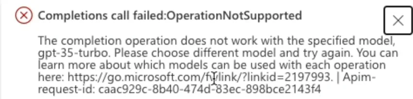 It’s also important to mention that depending on the model version you use it’s possible that you may see another error in the Completions playground since not all model versions work there. If you get an error similar to the following, go back to the deployments screen you were in earlier and create another model as shown earlier. But, this time select Auto-update to default for the version.