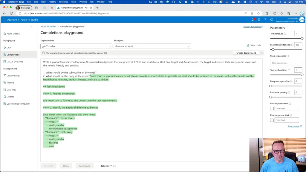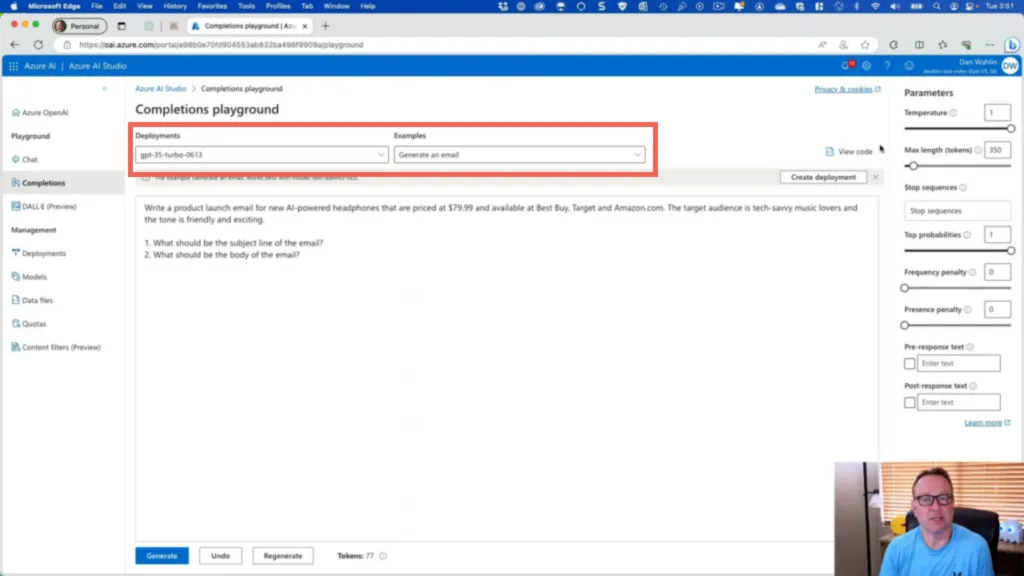 Wait for the new model to deploy and you should now be able to use the Completions playground and see the model in action with the Generate an email prompt.