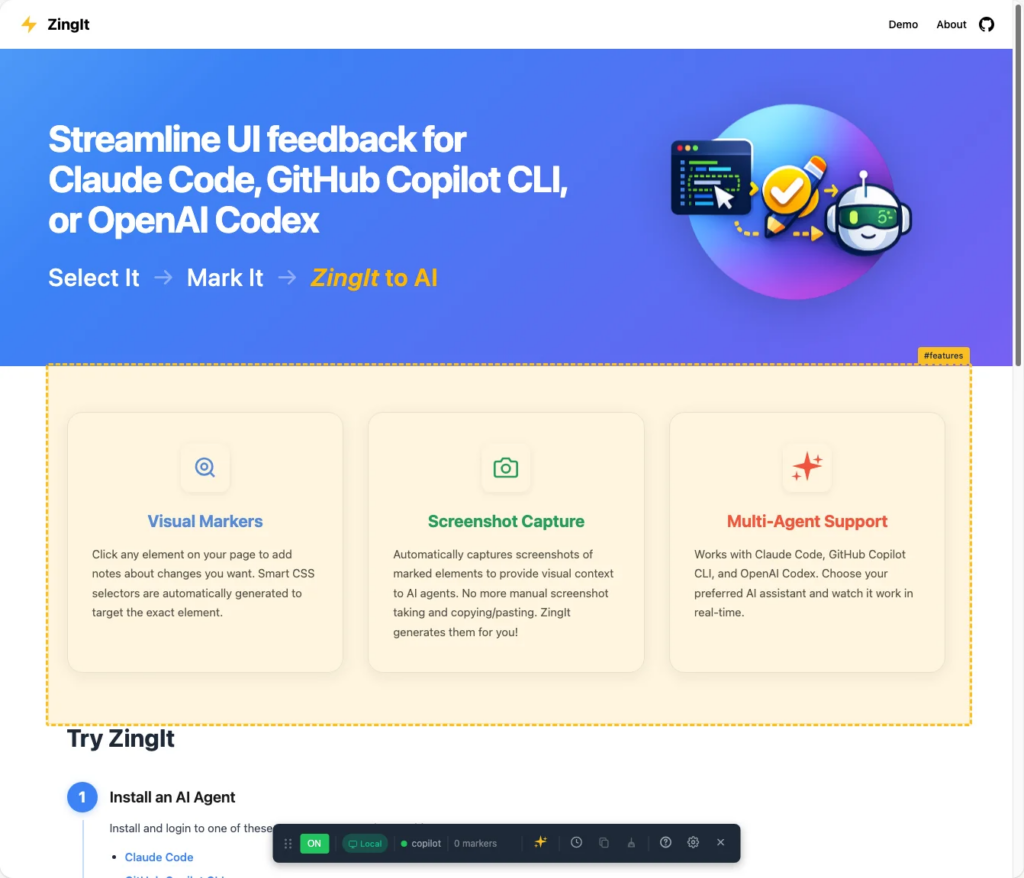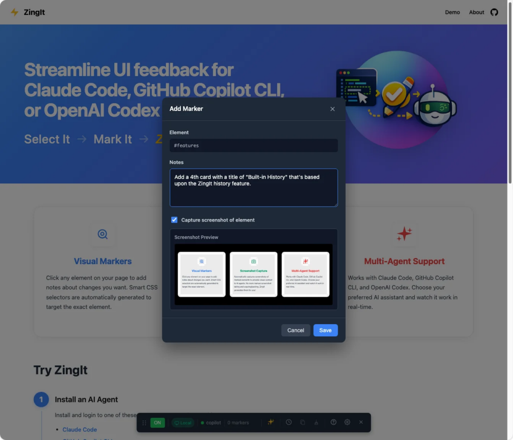 - Browser: You mark elements on your page. ZingIt captures the selector, HTML context, and a screenshot. The idea for that came from working on projects that used frame.io which lets you add comments at specific points in a video.