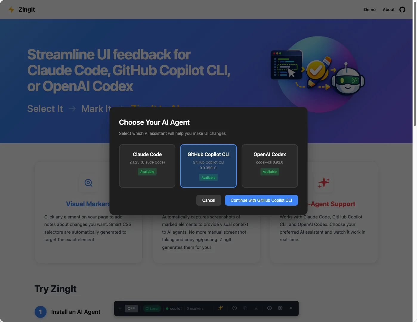 ZingIt doesn’t lock you into one AI assistant. It supports three major coding agents: