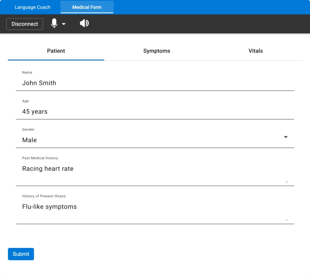 - Medical Form Assistant: Say “Patient John Smith, 42 years old, history of pneumonia” and it returns a JSON object like { “name”: “John Smith”, “age”: “42”, “notes”: “pneumonia” } and fills in a form for you. Medical assistants, nurses, and doctors can speak directly to a form (no keyboard required) as they’re busily hurrying around a hospital environment and have the form automatically filled in with patient details.